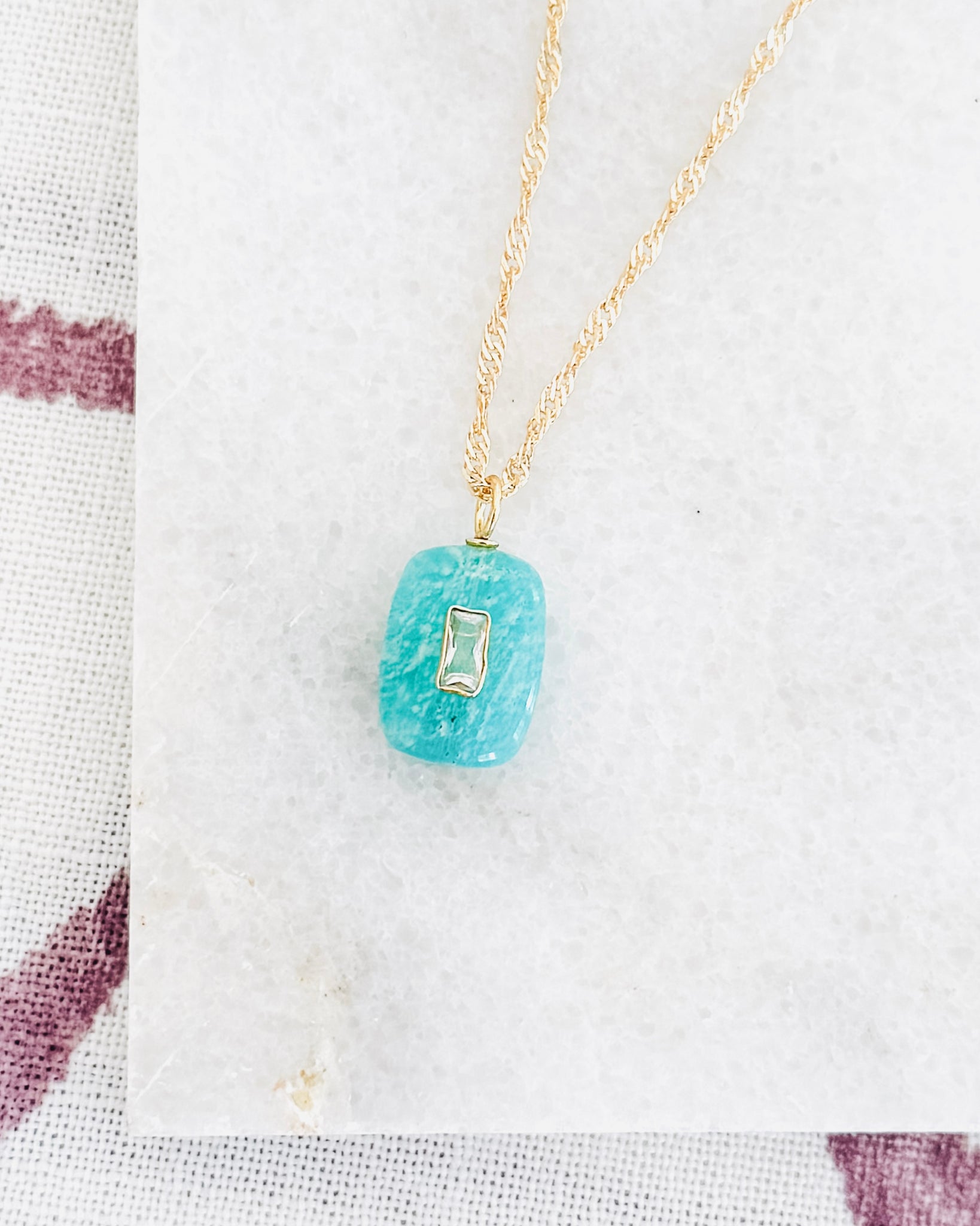Part of the Nora Collection, this necklace is made from 14k gold plated Amazonite stone with an inlay gemstone. It is paired with a 14k gold filled singapore chain.