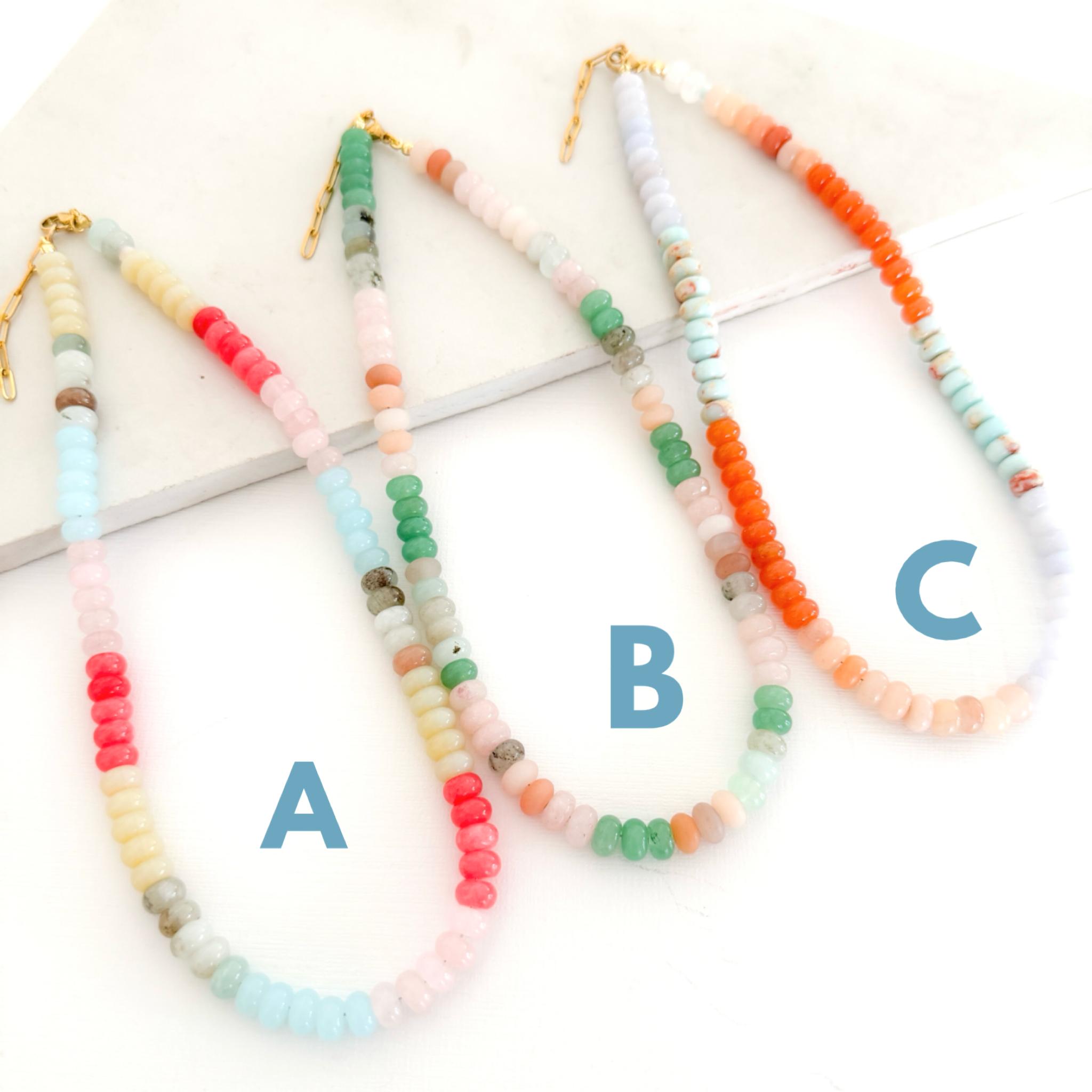 The color bead necklaces are made from jade rondelle beads and come in 3 different styles. Please note, each necklace may be slightly different in coloring due to using natural jade beads.