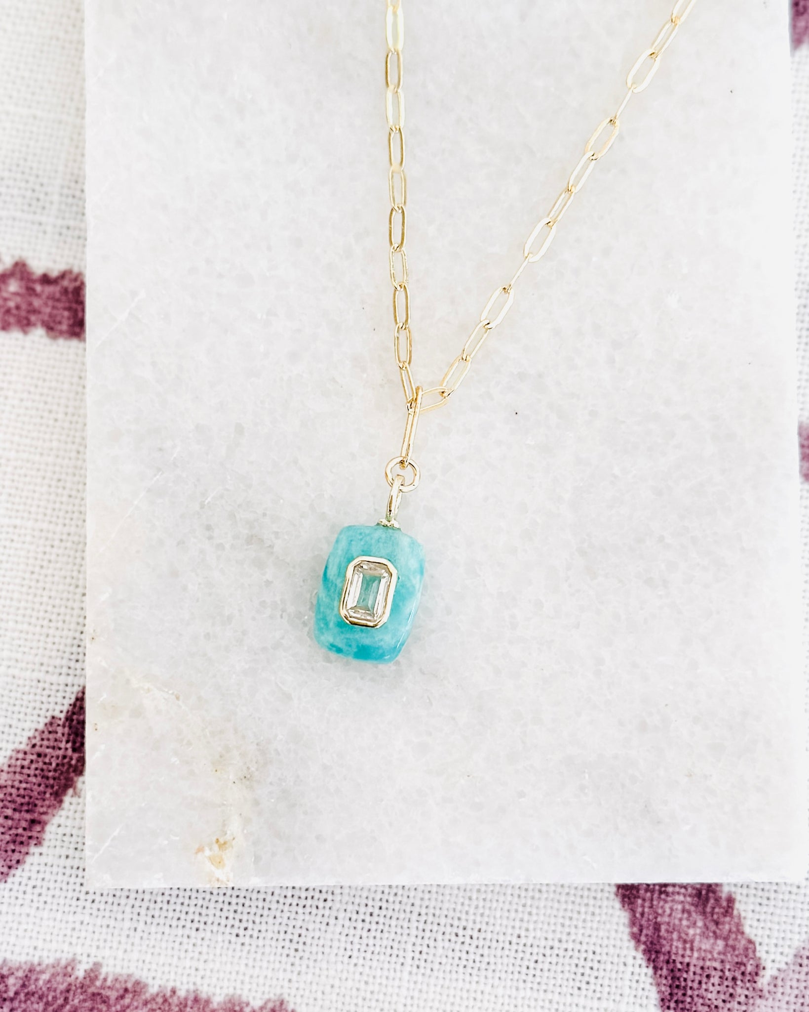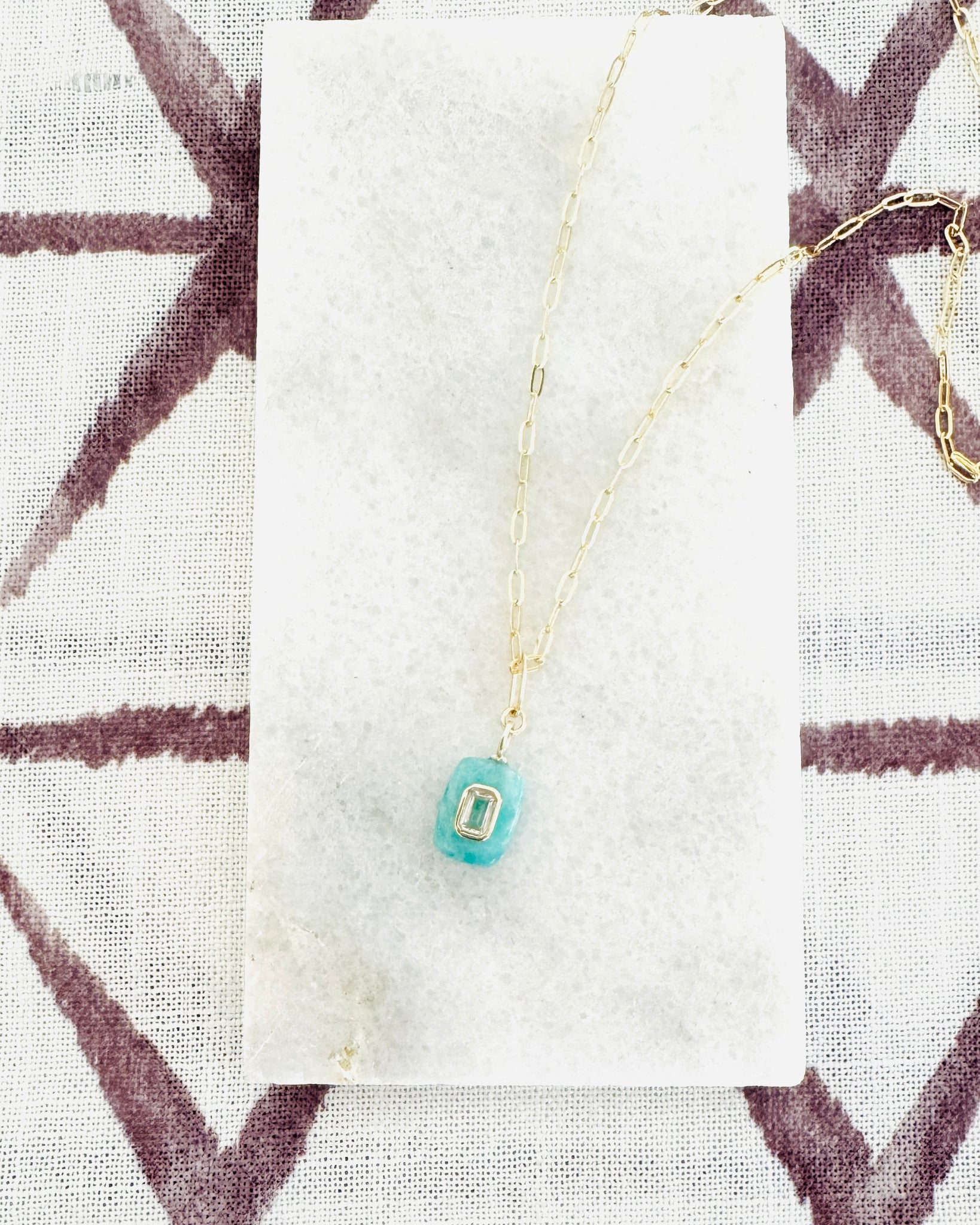 Part of the Nora Collection, this necklace is made with a 14k gold plated Amazonite stone with a white topaz inlay. It is paired with a 14k gold filled mini paperclip chain.